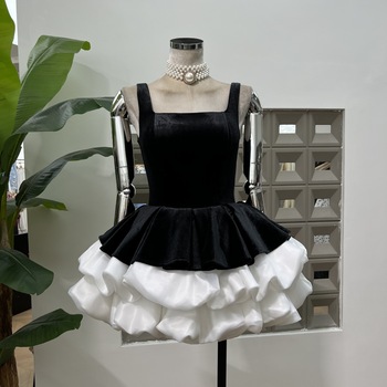 Nieuwe Franse Vierkante Kraag Contrast Fluwelen Strapless Zwarte Jurk Mode Mesh Patchwork Korte Jurk