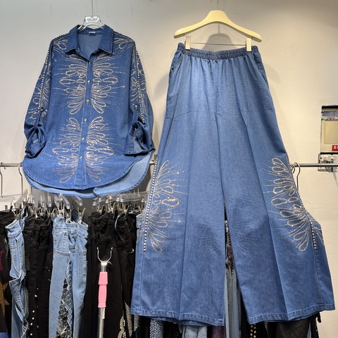 2025高級ヘビーインダストリーフラワーデニムシャツ女性用ルーズラペルビーズトップハイセンスヘビーインダストリーワイドレッグデニムスーツ