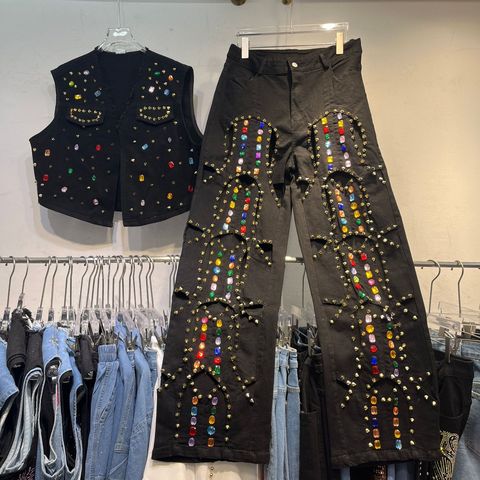 カラフルなラインストーンリベットデニムジャケット + ワイドレッグパンツセット