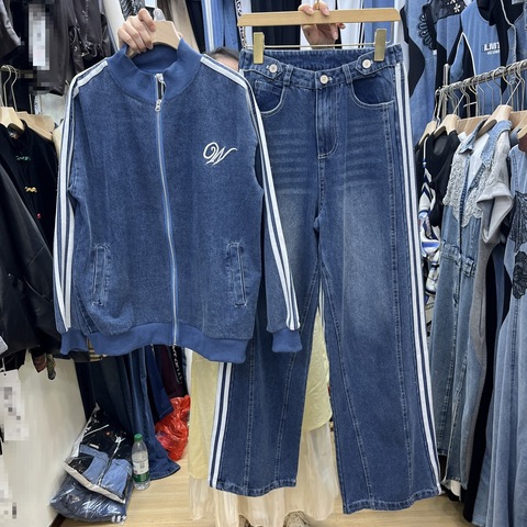 大型スポーティカジュアルスタンドアップ襟デニムジャケットパンツセット